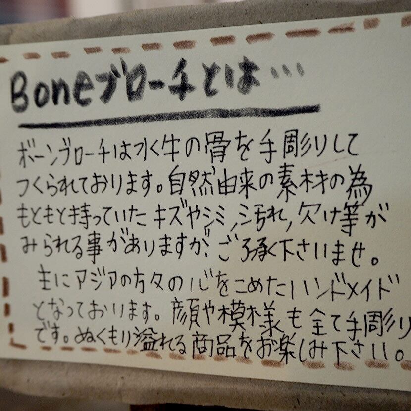 ボーンブローチは水牛の骨を手彫りして作られております。自然由来の素材のためもともと持っていた傷やシミ、汚れ、欠け等が見られることがありますが、ご了承くださいませ。